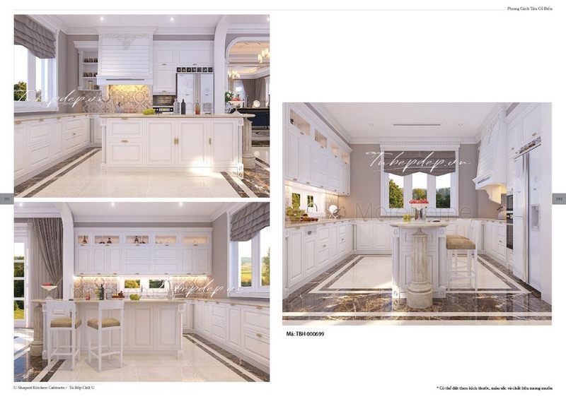 Hãy tận dụng ánh sáng từ bên ngoài để tạo nên một không gian sáng trắng tăng thêm độ sáng mà vẫn giữ được độ sang trọng và đẳng cấp cho biệt thự, nhà phố. KTS sẽ giúp bạn thiết kế một phòng bếp tân cổ điển theo ý muốn của bạn.